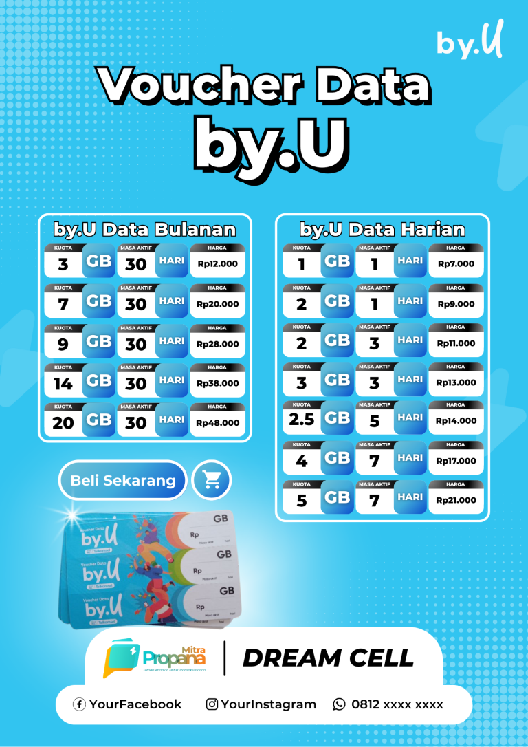 Template Pricelist Voucher Data ByU (Official) 2025 Silahkan edit Template Canva berikut sesuai dengan kebutuhan Anda. Kemudian cetak di percetakan terdekat. Bisa di edit via laptop dan smartphone. A3 A4 A5 Previous Post Template Pricelist Voucher Data Axis 2025 (Official) Next Post Template Pricelist Voucher Data XL Combo Flex 2025 (Official)