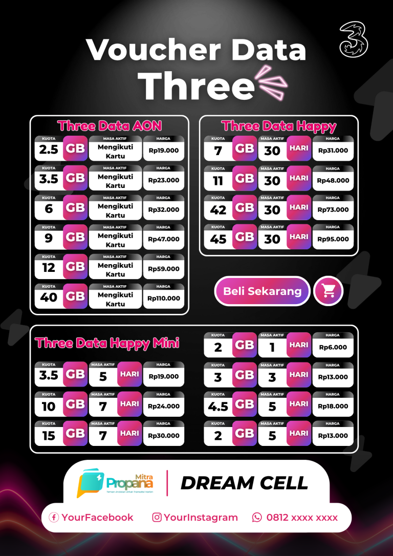 Template Pricelist Voucher Data Three (Official) 2025 Silahkan edit Template Canva berikut sesuai dengan kebutuhan Anda. Kemudian cetak di percetakan terdekat. Bisa di edit via laptop dan smartphone. A3 A4 A5 Previous Post Template Pricelist Voucher Data Smartfren 2025 (Official) Next Post Template Pricelist Voucher Data Axis 2025 (Official)