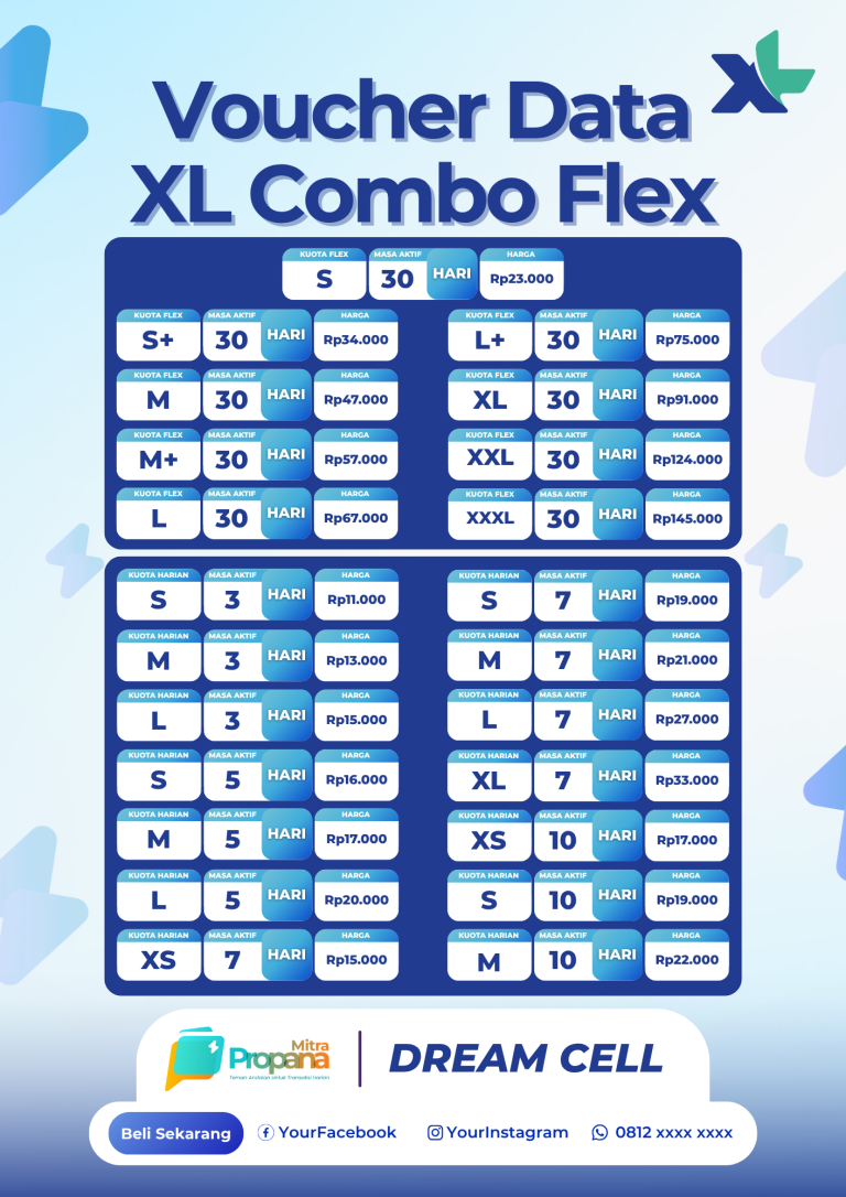 Template Pricelist Voucher Data XL Combo Flex (Official) 2025 Silahkan edit Template Canva berikut sesuai dengan kebutuhan Anda. Kemudian cetak di percetakan terdekat. Bisa di edit via laptop dan smartphone. A3 A4 A5 Previous Post Template Pricelist Voucher Data ByU 2025 (Official) Next Post Template Pricelist Voucher Data XL Bebas Puas 2025 (Official)